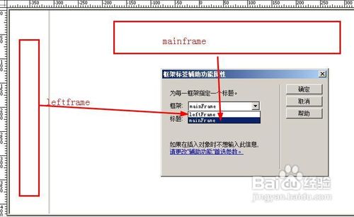 9、弹出了一个对话框,这个对话框要对页面的各个部分进行命名,这一步比较重要,一会我们要用到,所以看准,左栏叫做leftframe,右栏叫做mainframe。