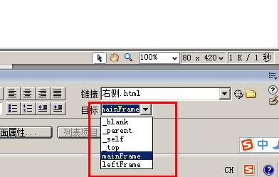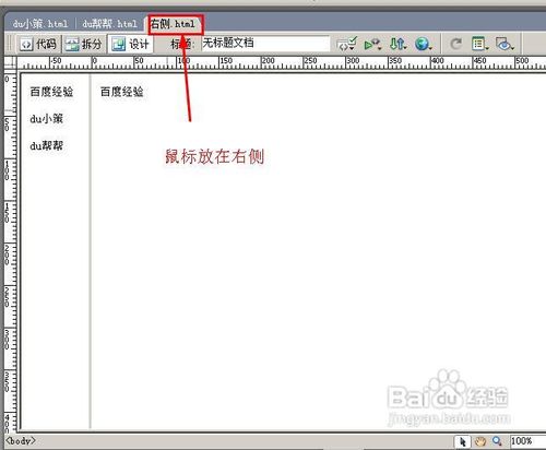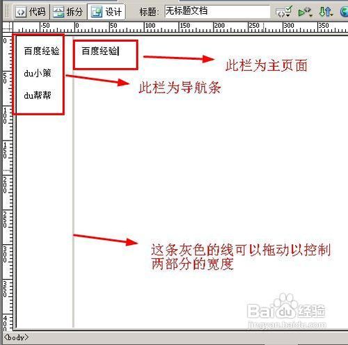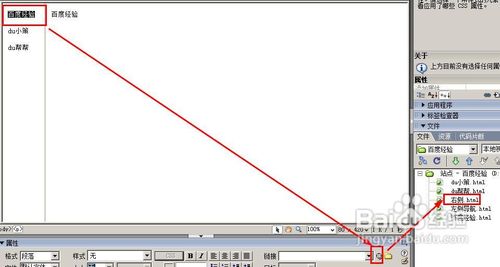 14、接下来我们要对左侧导航建立链接。选中左栏中“百度经验”,点击右下角的一个圆圈,拖动圆圈到右面的相应文件,这样就建立了一个链接。接着在界面的下面选择目标为mainframe。mainframe是我们在第九步中命名的右侧栏的名字,你可以返回去看看。百度经验这四个字建立了链接指向“右侧.html”这个文件,同时这个文件将在mainframe这个位置打开,也就是在右栏打开。