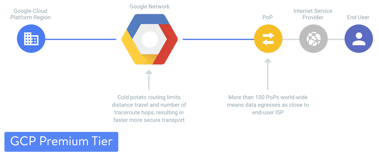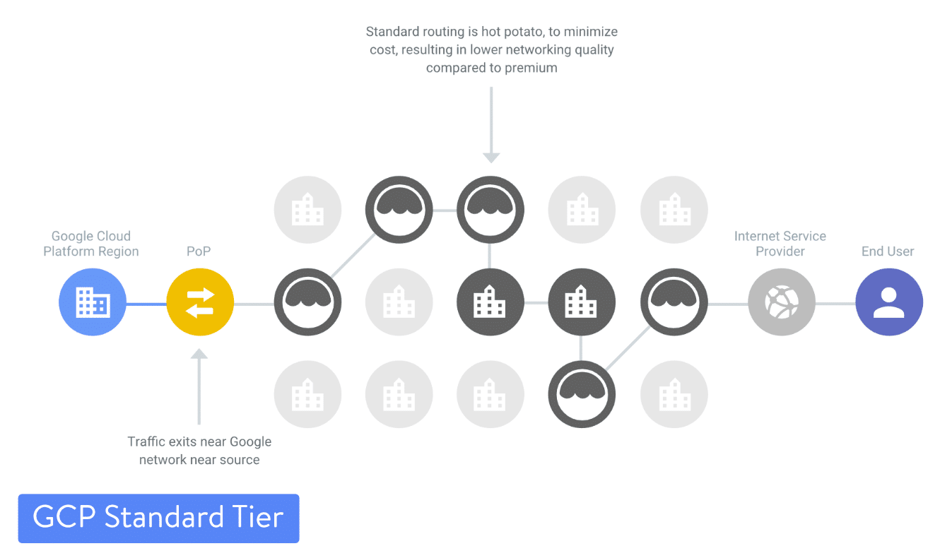 标准层提供的网络质量可与其他主要公共云相媲美。它通过传输 (ISP) 网络而不是 Google 的网络将 GCP 的出站流量传送到互联网。