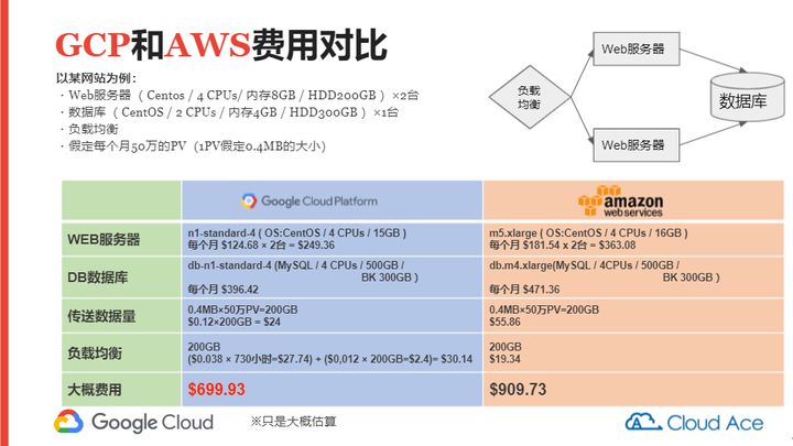 以下是某网站的GCP和AWS价格对比,相同的服务器和数据库,相同的使用量,谷歌云的价格为AWS价格的77%。虽然在实际的使用过程中,需求有所不同,但是总体而言,谷歌云的定价会比AWS低20%-30%。