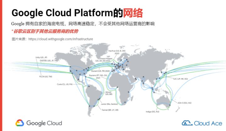 目前Google已于全球投资18条海底电缆、27个云计算区域(Cloud Region)、以及82个云计算可用区。使用自家的海底电缆使得谷歌云无需经过其他Pop节点,节省了在各个节点的时间,提高了速度和稳定性。
