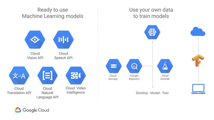 人工智能(AI)工具的选择上,Google也有针对不同程度的使用者提供相对应的服务。比方说:从简单可以直接拿来侦测图像内容的CloudVision API,亦或是自行部署机器学习模型的AI 平台、AutoML;又或是提供各种机器学习演算法给开发者撰写程式的Tensorflow,都能让使用者依照各自需求建立自己的AI流程,让本来复杂的程序变得更简单。
