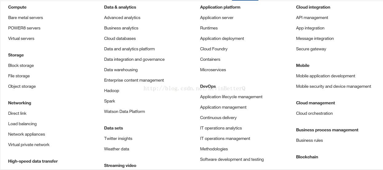 产品包含:计算、联网、存储、Web移动、数据库、智能分析、物联网、企业集成、安全、监控。