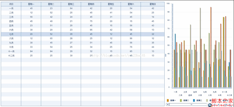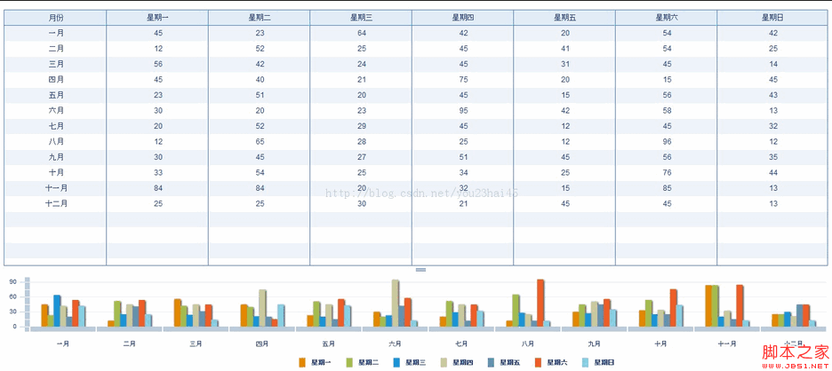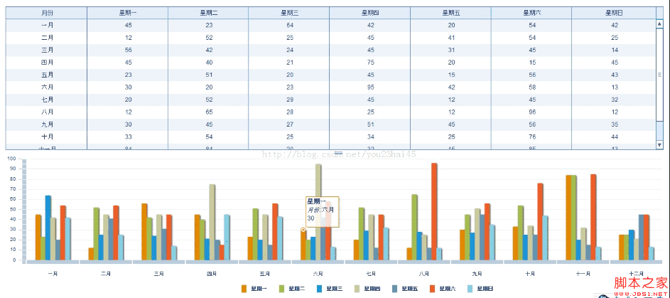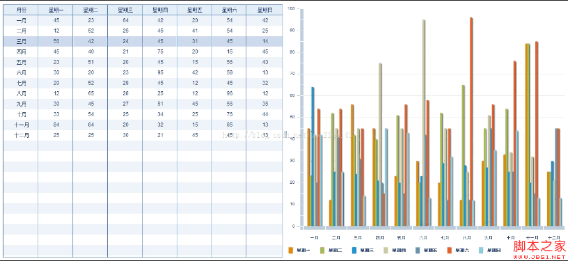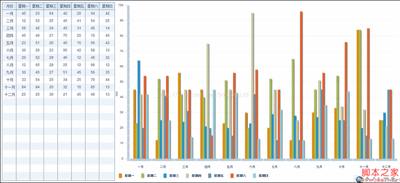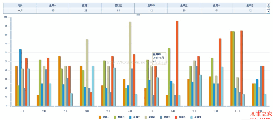 {month:"一月",Mon:"45",Tus:"23",Wed:"64",Thu:"42",Fri:"20",Sat:"54",Sun:"42"},