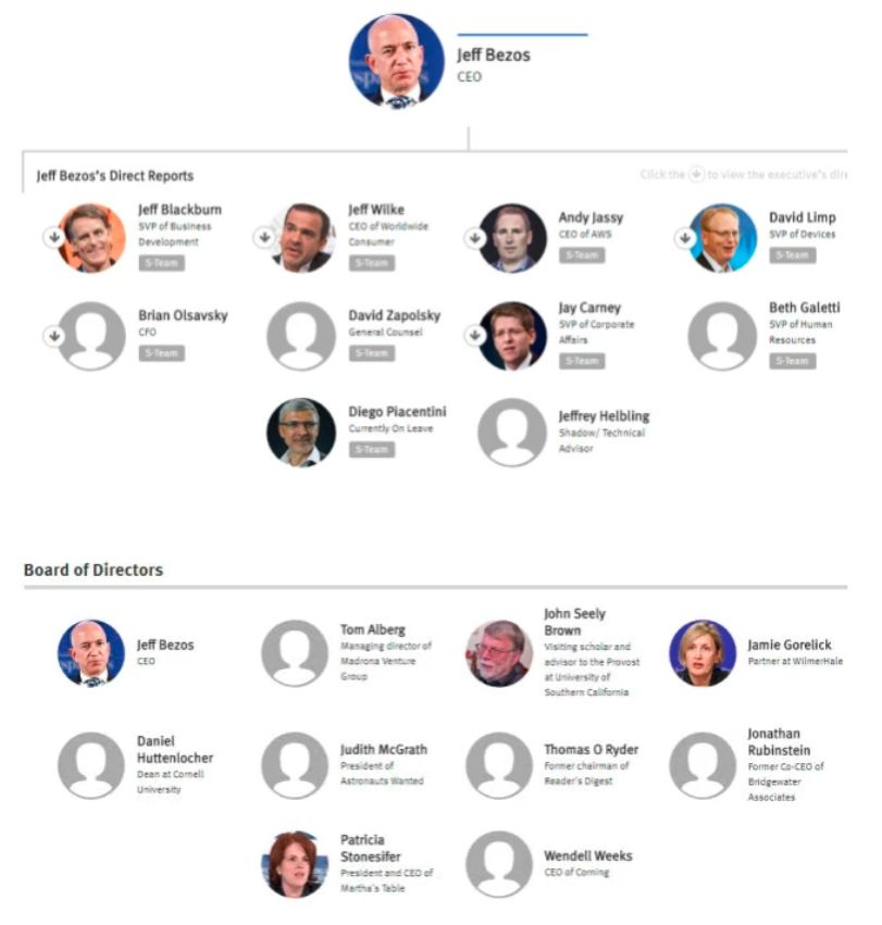 一般来说,一艘船能走多远是看船长的开拓精神和舵手,水手的能力。亚马逊有一支大约17人的高管团队,在亚马逊内部被称作“S小队”。有兴趣的朋友可以看看下图。