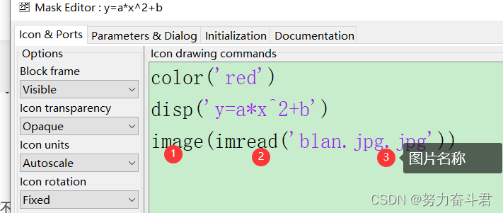 首先需要在Icon&.Ports页面的Icon Drawing Commands页面中输入M脚本,将文字、图像或者绘制线条等图示显示到子系统的图标上去。最常用的函数有disp , text, image和 color等。使用disp 函数将文本显示在模块居中的位置,如