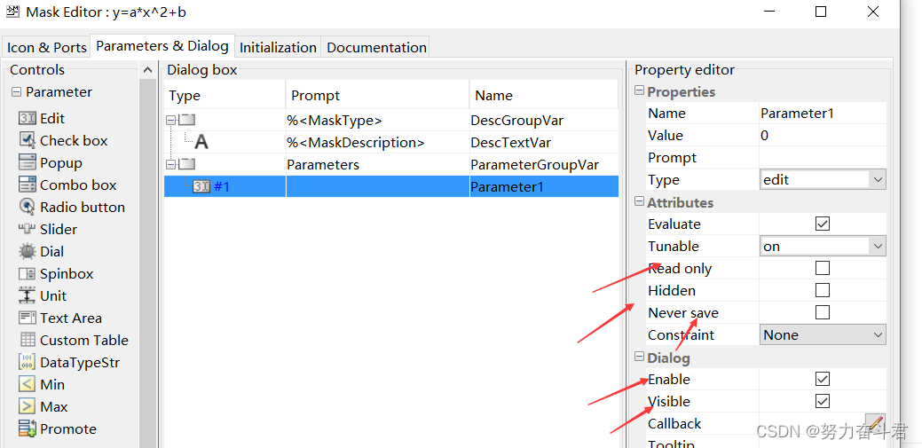 封装子系统y=a * x2十b时,需要为参数a,b提供2个数值输入控件(封装其他的也一样,比如PID,需要3个参数KP,KI,KD)。数值由用户指定,不限定取值范围,使用Edit 控件。