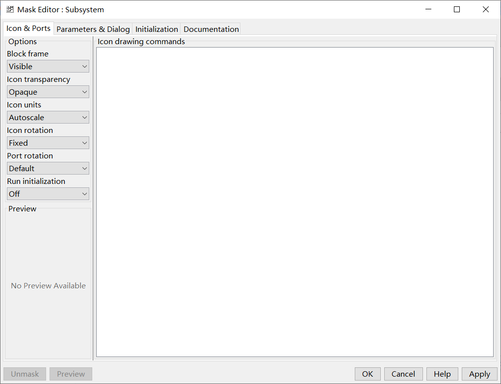 | 封装初始化代码 | 用于初始化封装模块或反映当前参数值的 MATLAB 代码。在 Mask Editor 对话框的 Initialization 窗格中添加封装初始化代码。例如,添加初始化代码以便自动设置参数值。 |