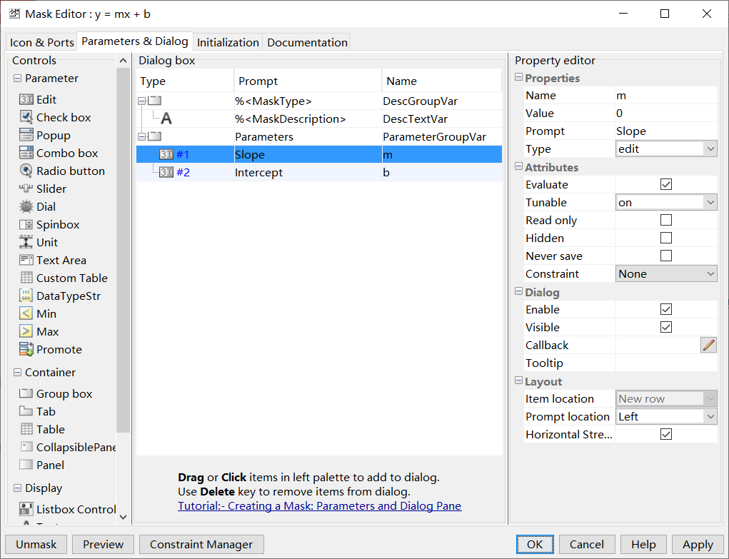 (2)分别在 Prompt 和 Name 列中键入值,在 Prompt 中键入 Slope 和 Intercept。在 Prompt 列中输入的值将出现在封装对话框中。在 Name 列中输入的值是封装参数名称。封装参数名称必须是有效的 MATLAB 名称。