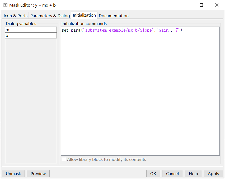 使用此窗格指定 MATLAB 代码来控制封装参数。例如,可以为封装参数提供预定义的值。以示例中的方程 y = mx + b 为例。要设置对应于“m”的子模块的值,可以使用初始化窗格中的 set_param 函数。