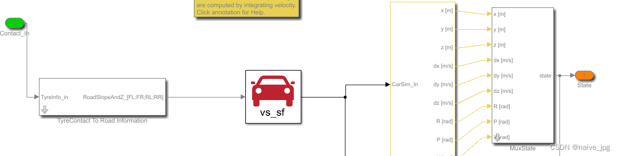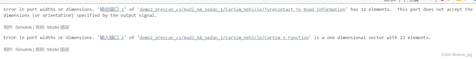 报出上述错误,显然是vs_sf的输入数量不符,可以打开vs_sf前面的TyreContact To Road Information模块细看,然后回到carsim中设置输入参数