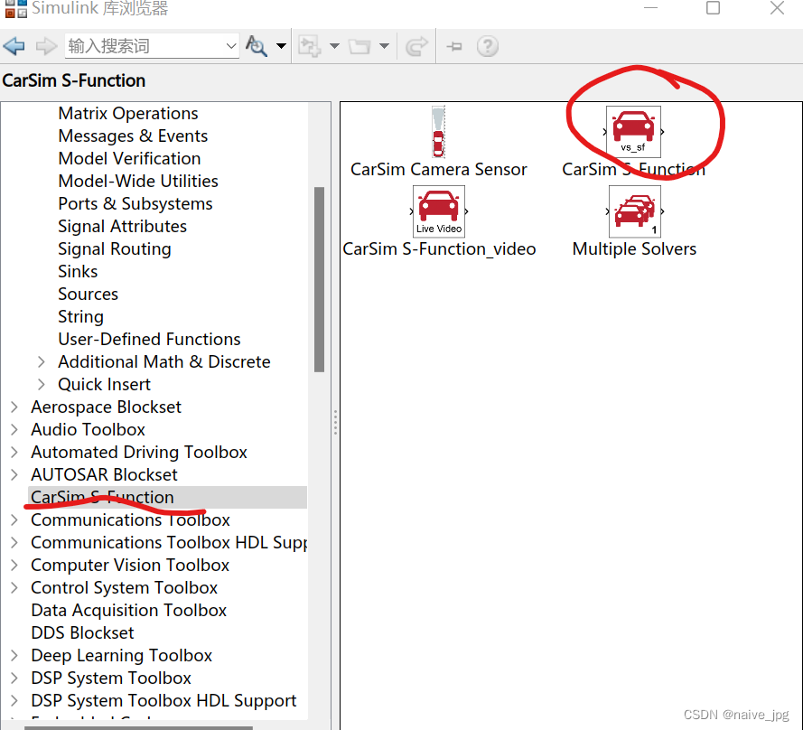 添加成功的标志是在simulink模型中可以在库浏览中找到carsim。