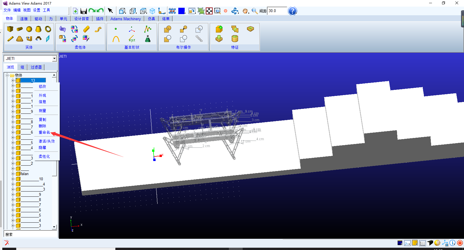 这个时候模型已经成功导入了,接下来还要做一些仿真前的处理,Adams导入Solidworks2018模型后所有零件的名称都会变成一些字符,所以我们要修改一下零件的名字方便我们后续添加运动副,点击物体把所有的零件重新重命名