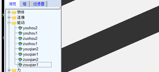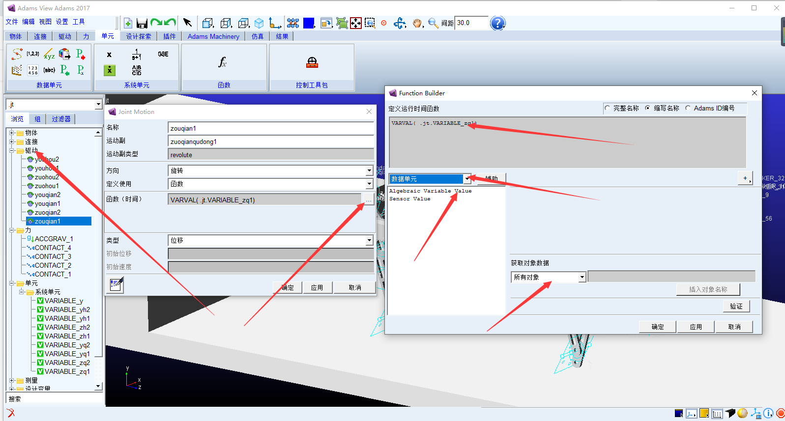 这里VARIABLE_y是机器人的质心位置在水平方向的变化,添加完八个状态变量后要把驱动函数修改一下,点击驱动把八个驱动里面的函数分别修改成VARVAL( Algebraic_Variable_Name )然后把之前创的八个状态变量名复制到对应的驱动即可