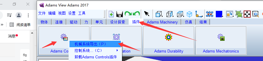 接下来创建MATLAB和Adams的联系,选择Adams Controls插件,导出机械系统
