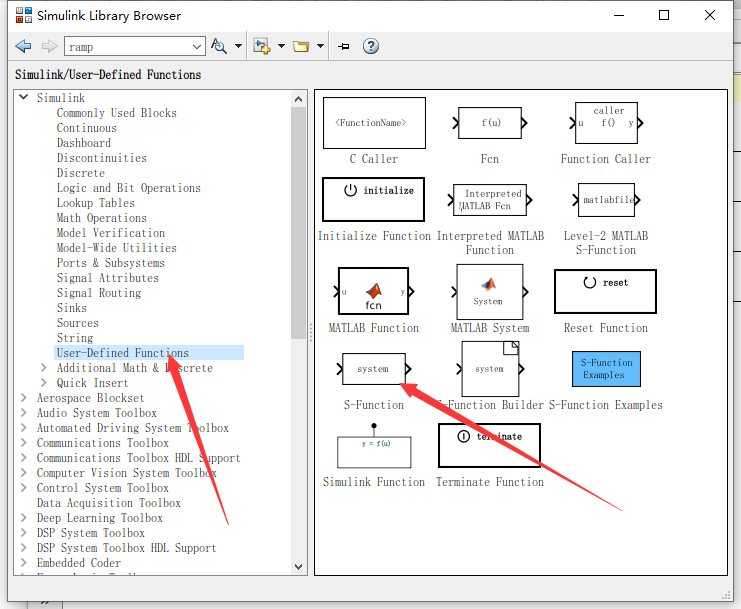 这里我们用的输入量是斜坡函数,在Simulink模块里面找到斜坡函数直接把他拖出来即可