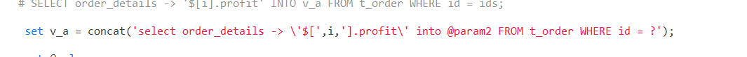 SET @sql = CONCAT('SELECT json -> '$[',i,']' INTO @v_a from id_json WHERE id = ?');