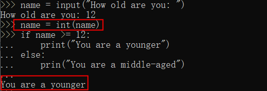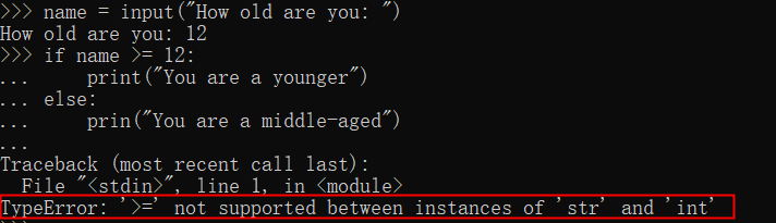 Python将用户输入解读为字符,如果要将字符作比较。需要使用函数int() 将数字的字符串表示转换为数值表示,如果没有就会报错,以下举例报错和正常情况: