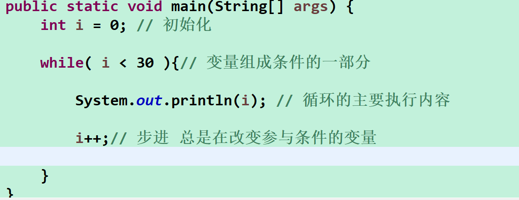为真 :会把while 循环里大括号里的所有内容执行一次 , 全部执行完毕之后 ,会再度来到条件处
