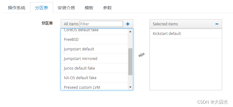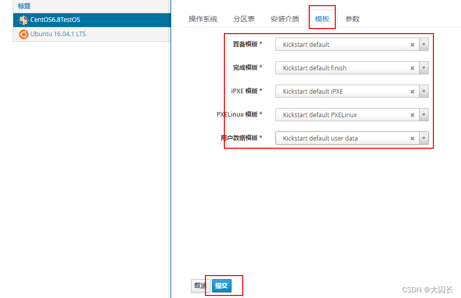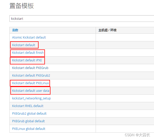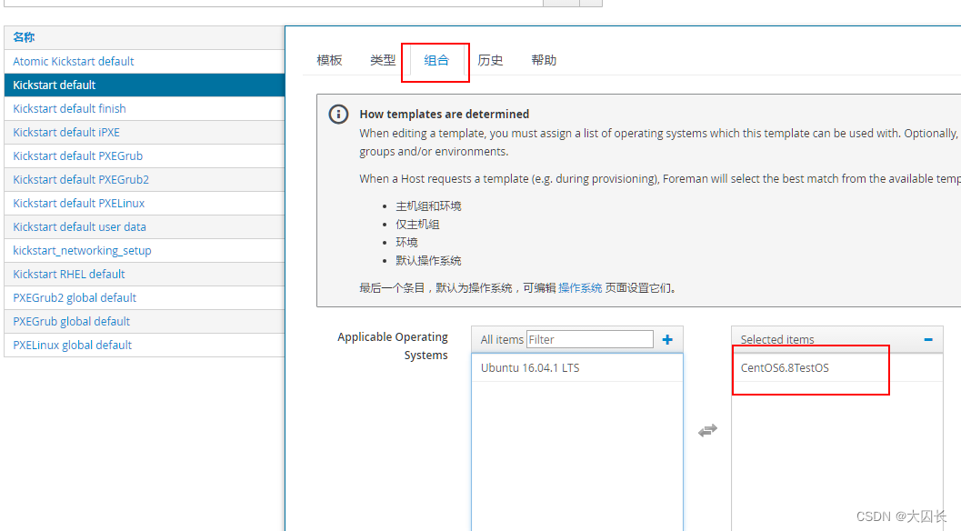 输入kickstart搜索,选择如下几个模板,依次点击组合添加创建的操作系统后提交(每个模板均需要各自提交),如果对KS的模板比较熟悉可自行修改,这里我们只使用默认模板