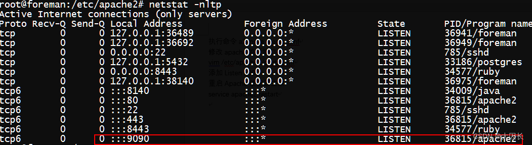 修改apache配置,这里我们使用9090端口作为http服务(此步在后边重新使用DHCP配置Foreman的时候会失效,因此可放到后边配置,在此配置是为了让流程连贯)