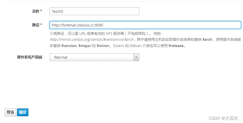 填上名称和刚才配置的源地址,选择产品线,CentOS属于Redhat阵营