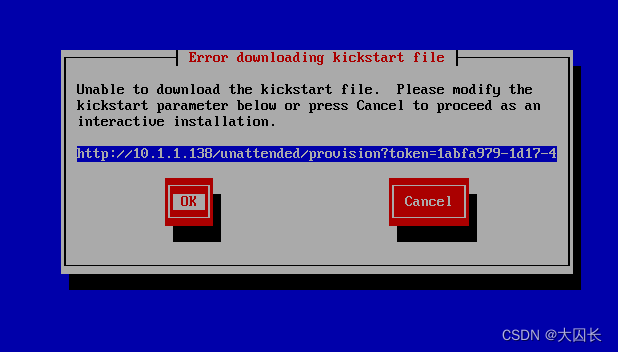 此处提示不能找到kickstart文件,因为我们使用的不是FQDN,或者我们的DNS配置成为了网关.2地址,如果是foremanproxyDNS(.138)服务器的地址是可以正确解析的,我们改成IP