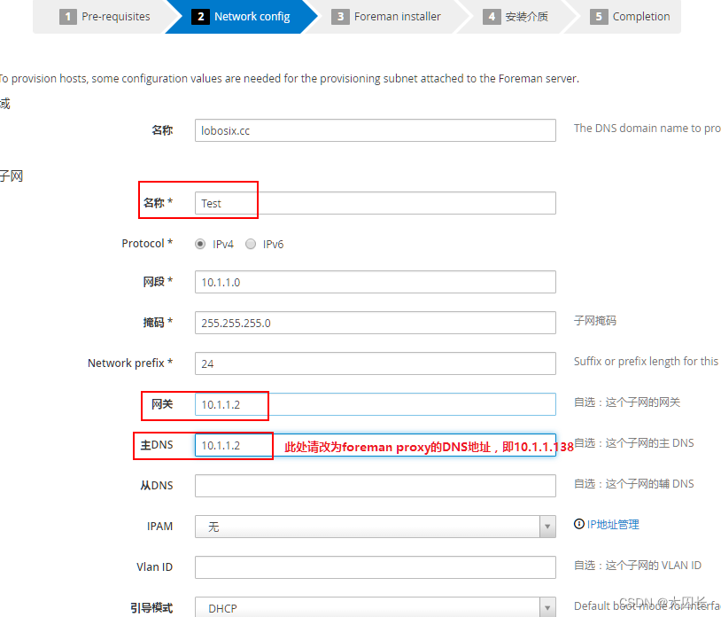 修改名称,网关,DNS,其他默认,提交,这里我们使用VMWare的NAT网关和foreman proxy的DNS服务,所以下图中的DNS应该修改为10.1.1.138(下文涉及DNS均应为10.1.1.138),引导模式默认使用DHCP,这就是我们为什么关闭VMWare的NAT模式DHCP的原因,IPAM地址管理可以指定分配的IP范围,这里我们忽略