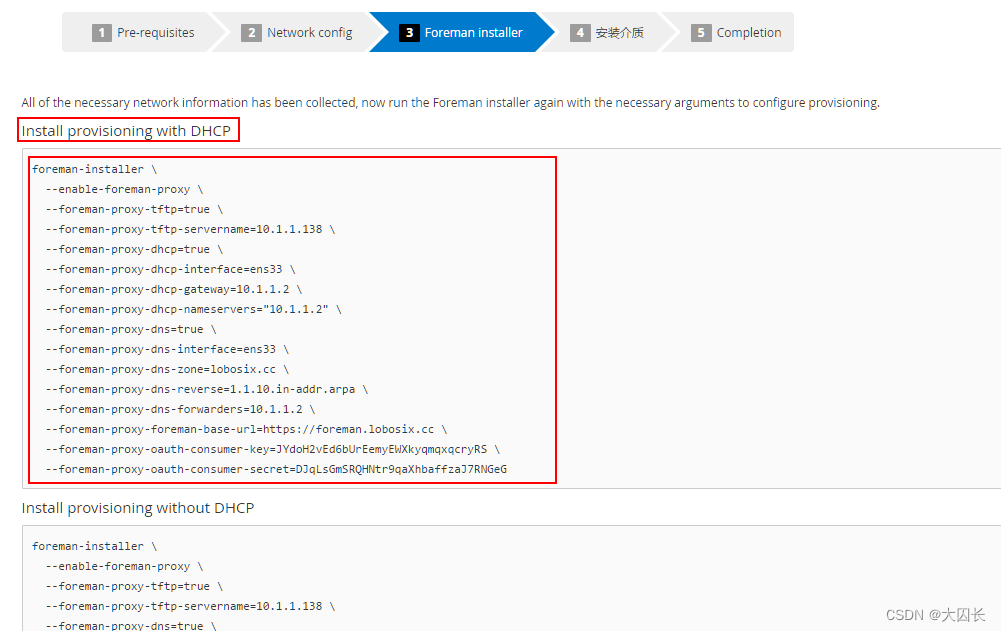 选择第一个使用DHCP的内容,复制并在Foreman机器上运行注意其中两项我们改一下
