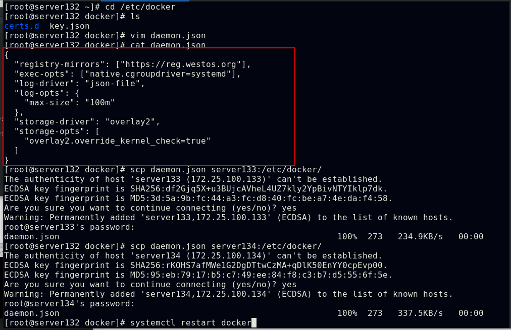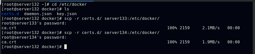 复制证书文件至节点的docker配置目录下,重启节点的docker服务