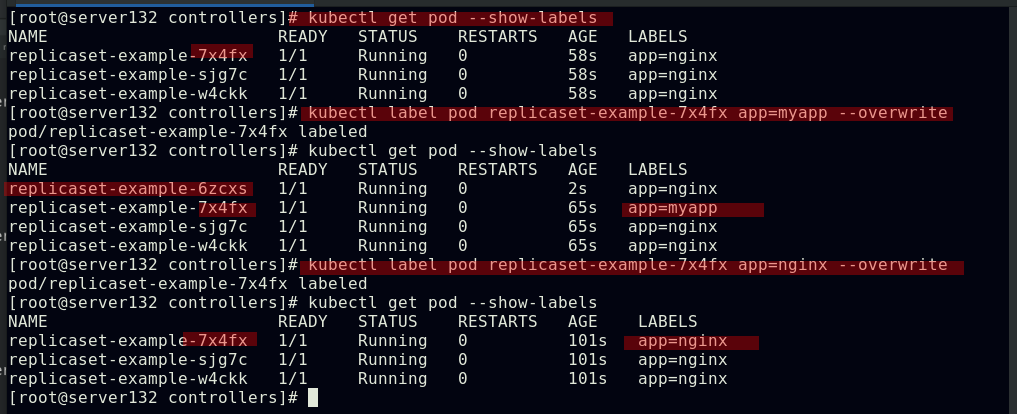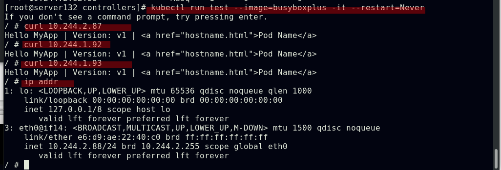 ##删除控制器下的pod副本,控制器会自动启动一个新的pod顶上来,并且会重新获取新的IP,因为之前设置其的副本数始终为2