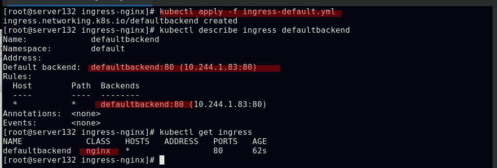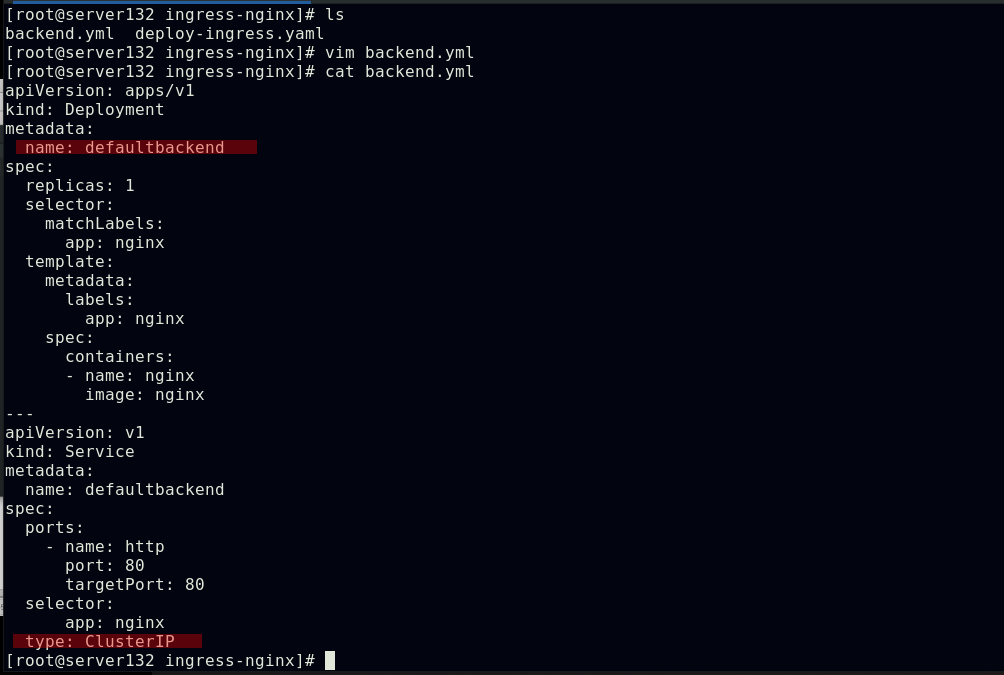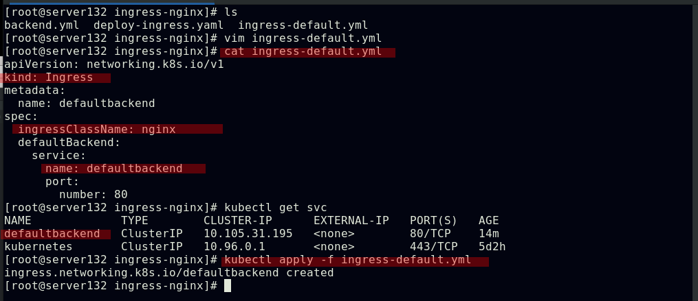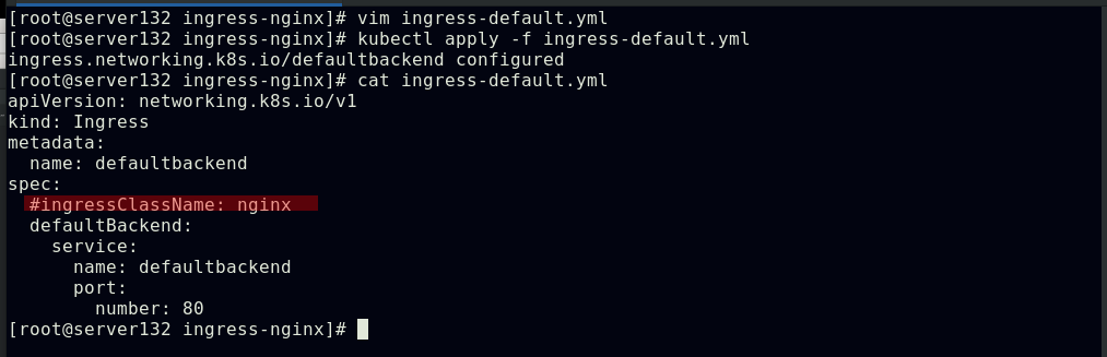 ##编写ingress资源文件,配置我们自主创建的服务作为ingress的默认后端,此处文件中的默认后端服务名称需要和创建的服务名称相对应;ingress类名称需要和初始ingress-nginx资源文件中的类名称对应