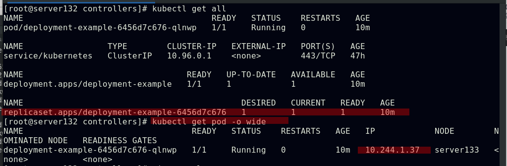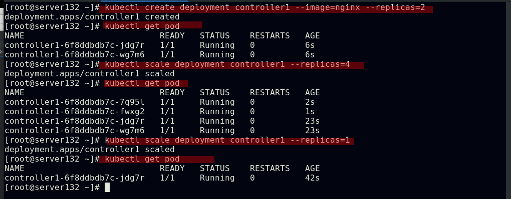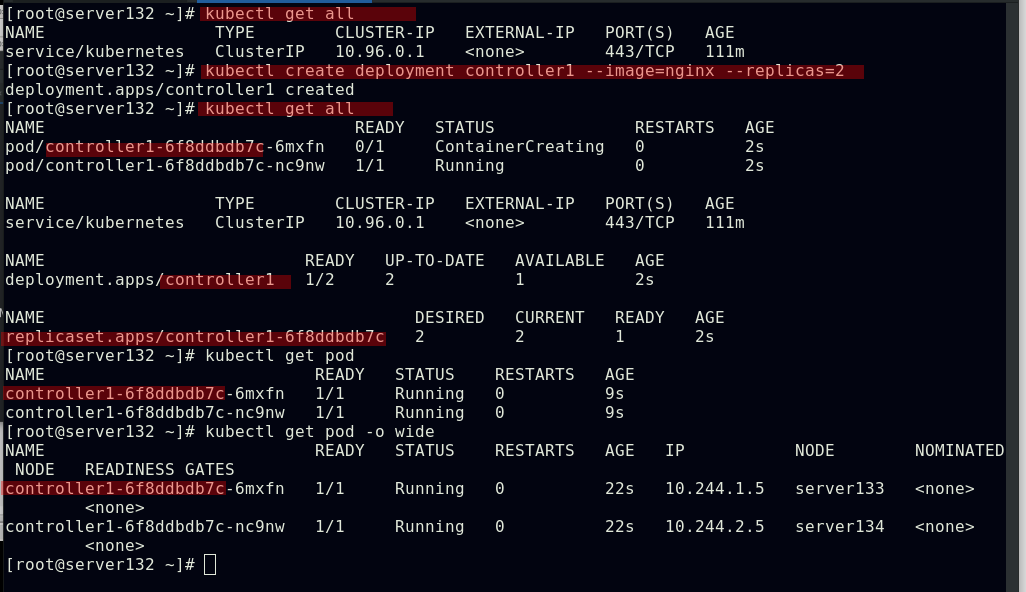 ##创建副本数始终为2的控制器controller1,会生成两个pod;controller1-6f8ddbdb7c-nc9nw分别可以理解为:控制器名称,控制器的标识,pod副本的标识