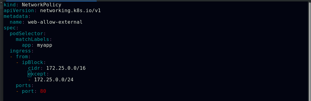 网络策略 | Kubernetespod is allowed to communicate with various network "entities" (we use the word "entity" here to avoid overloading the more common terms such as "endpoints" and "services", which have specific Kubernetes connotations) over the network. -- 如果你希望在 IP 地址或端口层面(OSI 第 3 层或第 4 层)控制网络流量, 则你可以考虑为集群中特定应用使用 Kubernetes 网络策略(NetworkPolicy)。 NetworkPolicy 是一种以应用为中心的结构,允许你设置如何允许 Pod 与网络上的各类网络“实体” (我们这里使用实体以避免过度使用诸如“端点”和“服务”这类常用术语, 这些术语在 Kubernetes 中有特定含义)通信。Pod 可以通信的 Pod 是通过如下三个标识符的组合来辩识的: 其他被允许的 Pods(例外:Pod 无法阻塞对自身的访问) 被允许的名字空间 IP 组块(例外:与 Pod 运行所在的节点的通信总是被允许的, 无论 Pod 或节点的 IP 地址) selector to specify what traffic is allowed to and from the Pod(s) that match the selector.