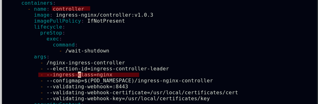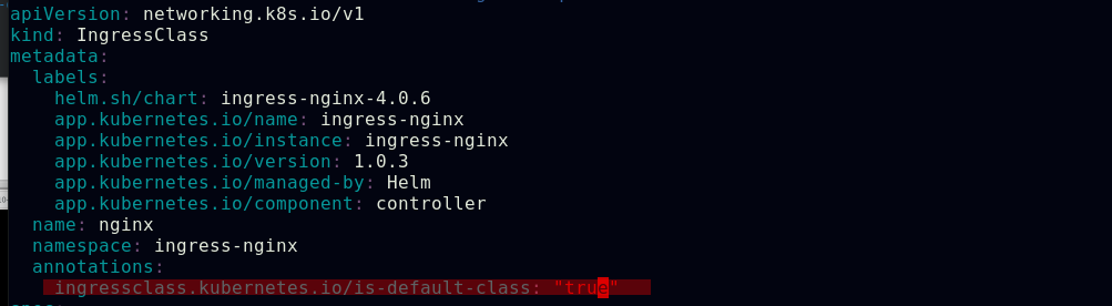 ##可以在ingress-nginx清单文件中的ingressclass资源下添加注释,此注释会确保新的未指定ingress类的ingress资源能够被分配为这个默认的ingress类