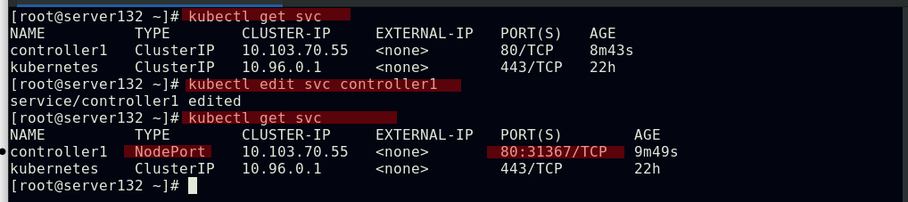 ##将服务类型更改为NodePort形式,此时集群外部即可访问pod;也可通过参数--type=NodePort在创建service时指定类型