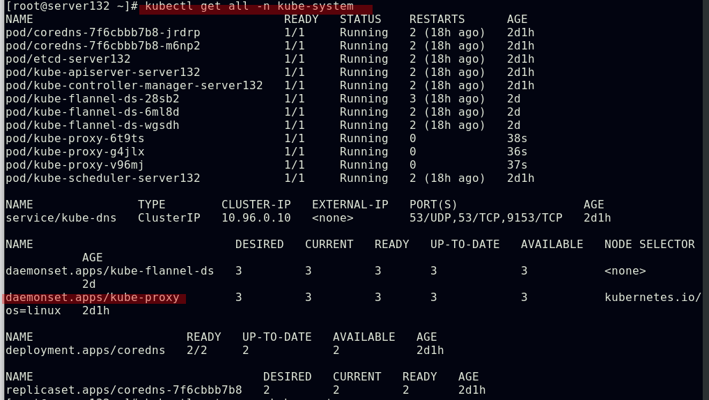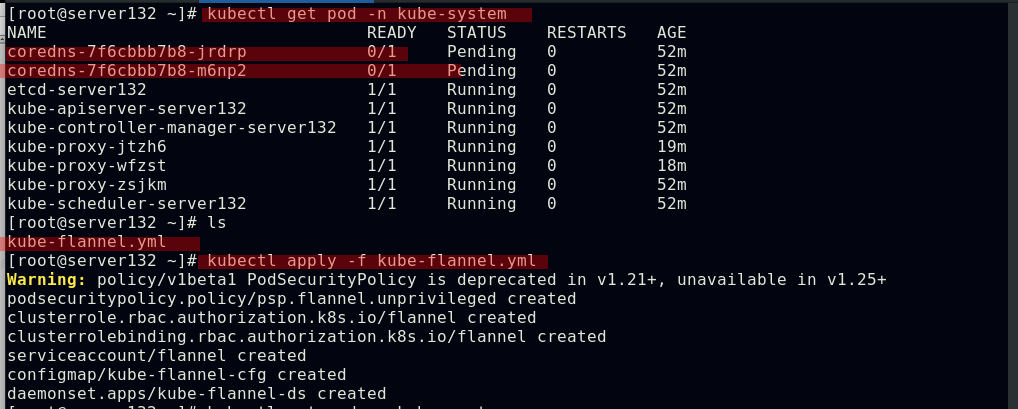 ##在集群master端应用flannel网络组件的资源文件,此时集群中的所有节点均为就绪状态,集群的核心dns服务也正常启动