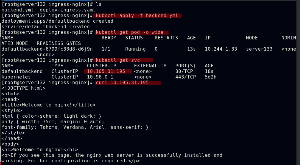 ##应用资源文件后,我们创建的服务和后端将作为ingress的默认服务和后端,此时集群外部及可通过NodeIP:NodePort访问到集群的ingress服务