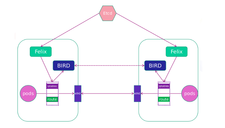 BIRD:一个标准的路由程序,它会从内核里面获取哪一些IP的路由发生了变化,然后通过标准BGP的路由协议扩散到整个集群其他的宿主机上,让外界都知道这个IP在这里,路由的时候到这里来