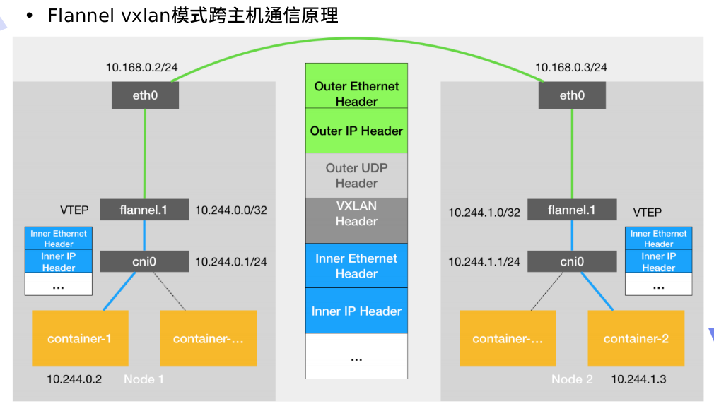 VTEP:VXLAN Tunnel End Point(虚拟隧道端点),在Flannel中VNI的默认值是1,这也是为什么宿主机的VTEP设备都叫flannel.1的原因