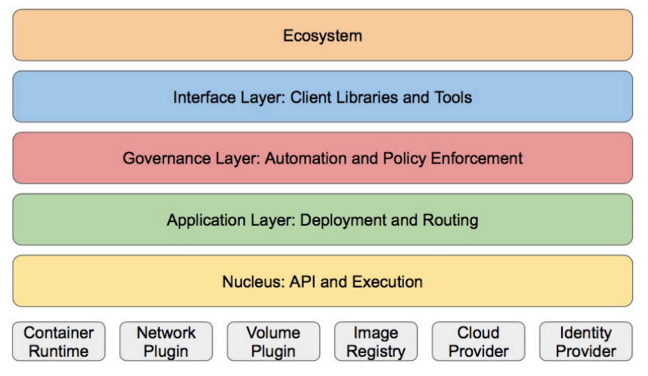 Kubernetes外部:日志、监控、配置管理、CI、CD、Workflow、FaaS、OTS应用、ChatOps等 Kubernetes内部:CRI、CNI、CVI、镜像仓库、Cloud Provider、集群自身的配置和管理等