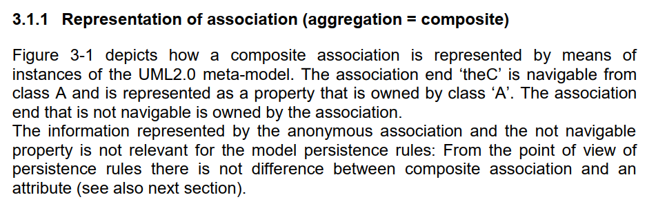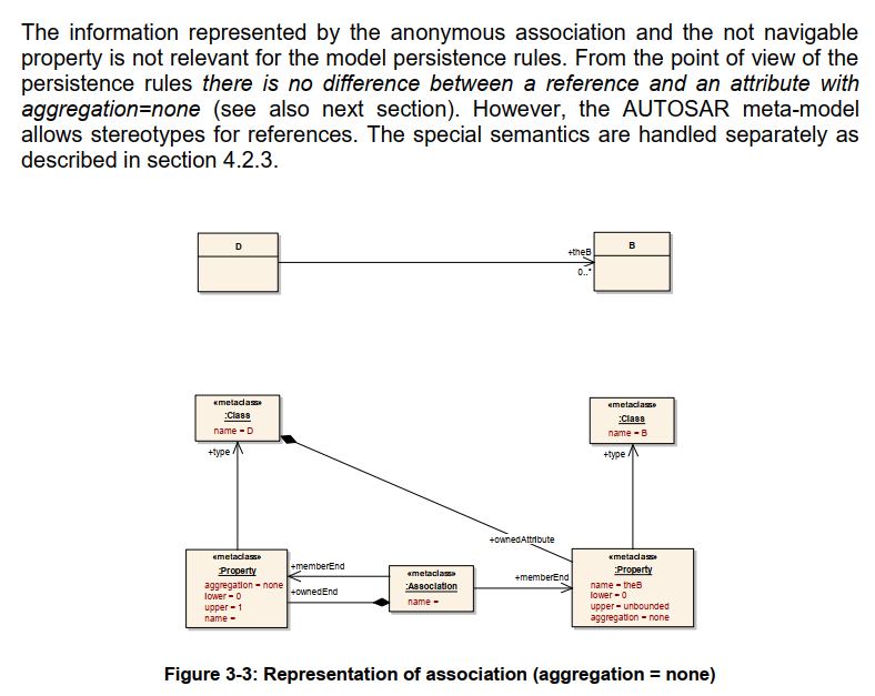 匿名关联和不可导航属性表示的信息与模型持久性规则无关。从持久性规则的角度来看,引用和具有aggregation=none 的属性之间没有区别(另请参见下一节)。 但是,AUTOSAR 元模型允许引用的构造型。特殊语义按 4.2.3 节所述单独处理。