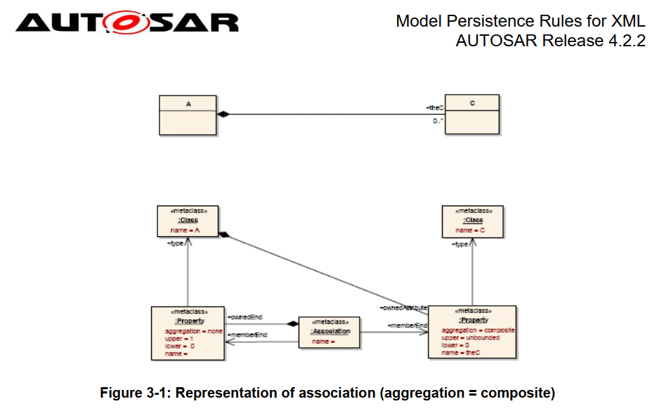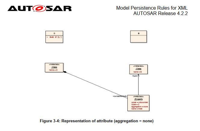 - 根据 AUTOSAR 模板配置文件,只允许使用aggregation=composite 的属性。 但是,XML 的持久性规则涵盖了这些属性,因为它们不会增加复杂性:对于带有 Aggregation=none 的 XML 属性的持久性规则(在本节中描述)等价于带有aggregation=none 的关联(在 3.1.3 节中描述)。
