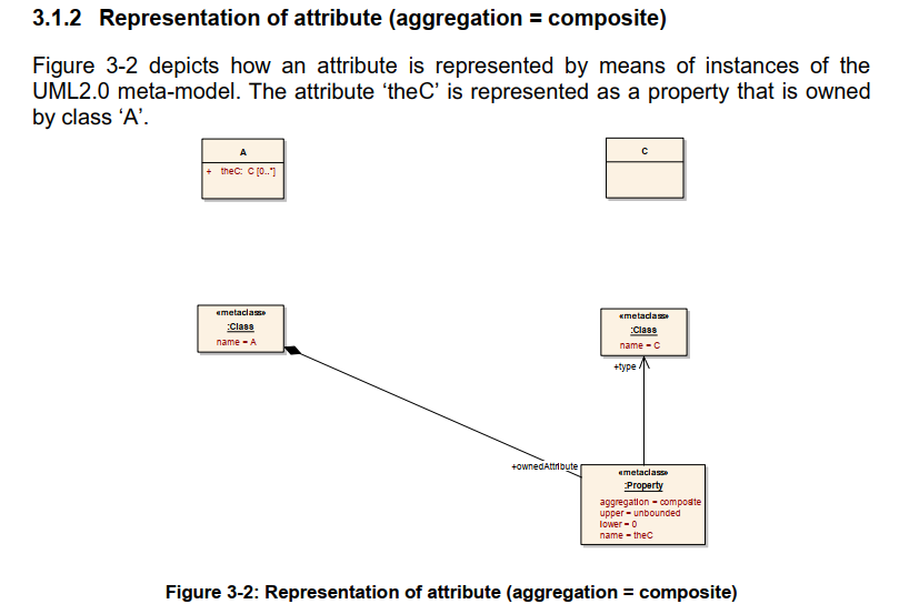 图 3-2 描述了如何通过 UML2.0 元模型的实例来表示属性。 属性“theC”表示为类“A”拥有的属性。
