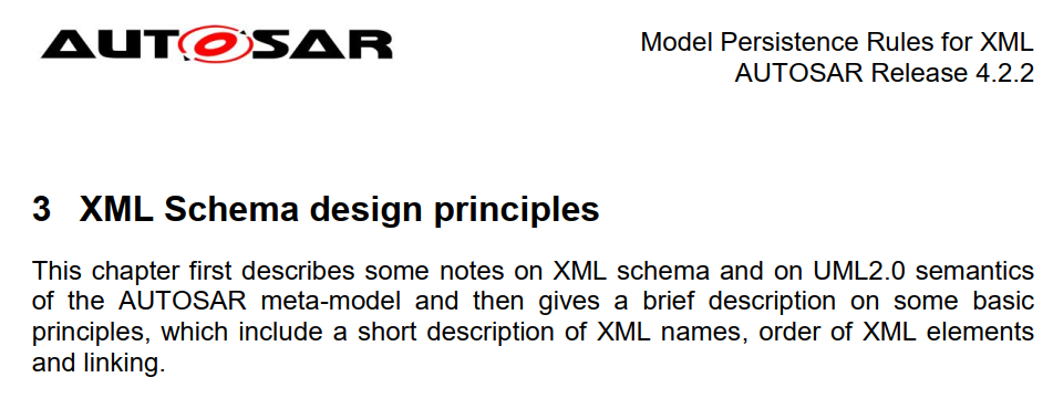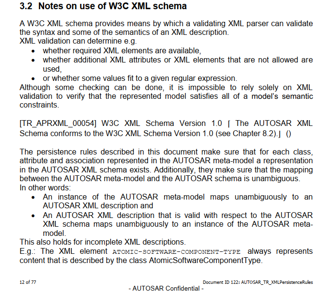 [TR_APRXML_00054] W3C XML Schema Version 1.0 ⌈ AUTOSAR XML Schema 符合 W3C XML Schema Version 1.0(参见第 8.2 章)。⌋ () 本文档中描述的持久性规则确保对于在 AUTOSAR 元模型存在于 AUTOSAR XML 模式中。 此外,他们确保 AUTOSAR 元模型和 AUTOSAR 模式之间的映射是明确的。