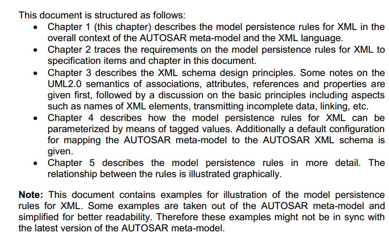 • 第 1 章(本章)在 AUTOSAR 元模型和 XML 语言的整体上下文中描述了 XML 的模型持久性规则。