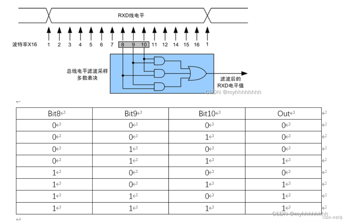 这是因为:在数据的传输中,信号可能受到一些干扰而产生一些抖动(比如说电磁兼容性设计中的近端串扰),如果接收端只对这些信号进行一次采样,那么它有可能采样到的是不准确的数据,所以接收端在采样时,通常都要采样多次,然后通过处理获得准确的数据,比如说,我们可以用多数表决的方法来在接收端进行多次采样,得到准确值,下图展现了16倍频采样的多数表决电路结构和它的真值表。
