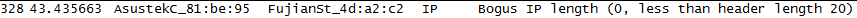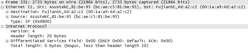 该报文的源IP和目的IP都只解析以太网层的设备名,而不是IP地址,解析信息是Bogus IP length(0, less than header length 20)。