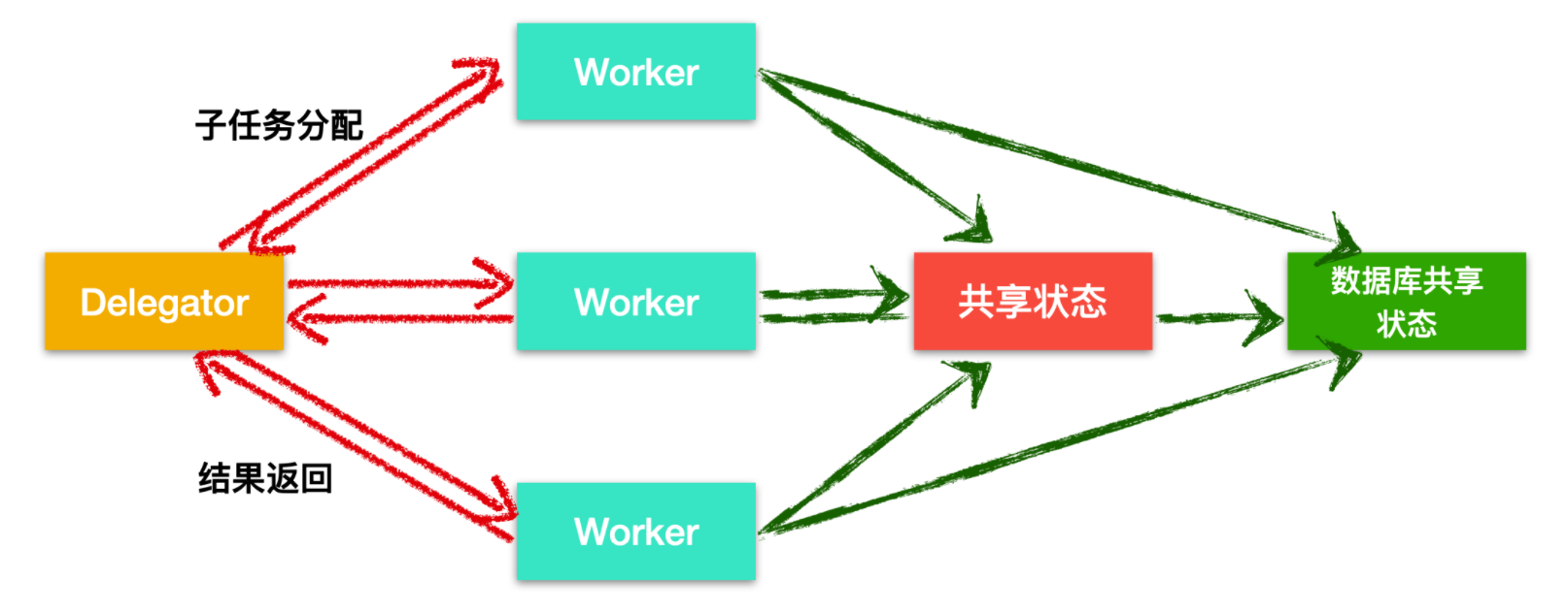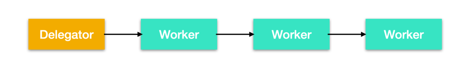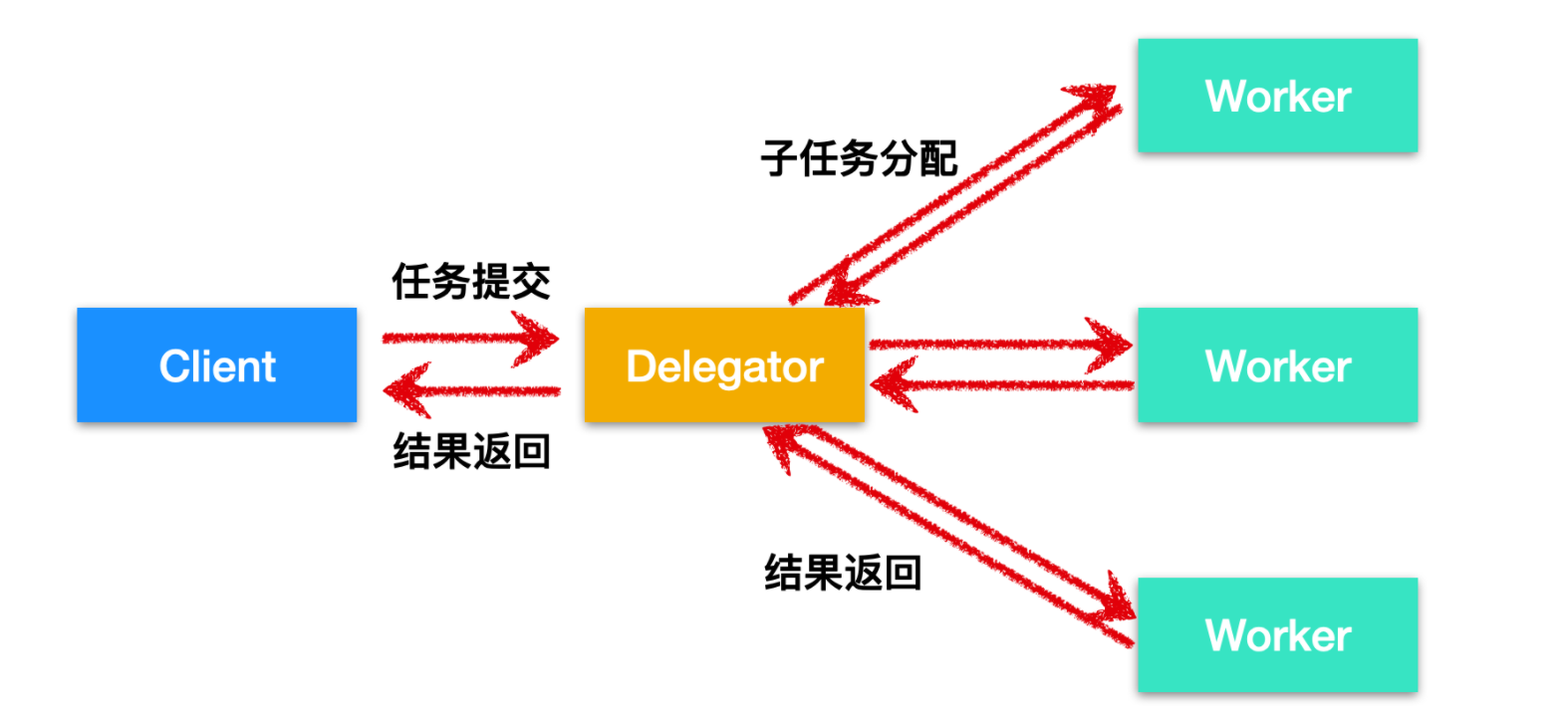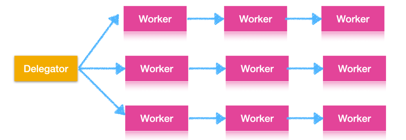 并行 worker 的核心思想是,它主要有两个进程即代理人和工人,Delegator 负责接收来自客户端的任务并把任务下发,交给具体的 Worker 进行处理,Worker 处理完成后把结果返回给 Delegator,在 Delegator 接收到 Worker 处理的结果后对其进行汇总,然后交给客户端。