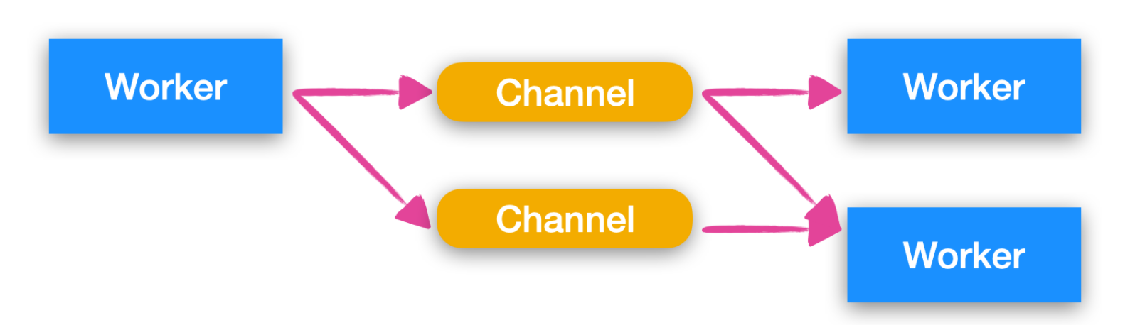 在 Channel 模型中,worker 通常不会直接通信,与此相对的,他们通常将事件发送到不同的 通道(Channel)上,然后其他 worker 可以在这些通道上获取消息,下面是 Channel 的模型图